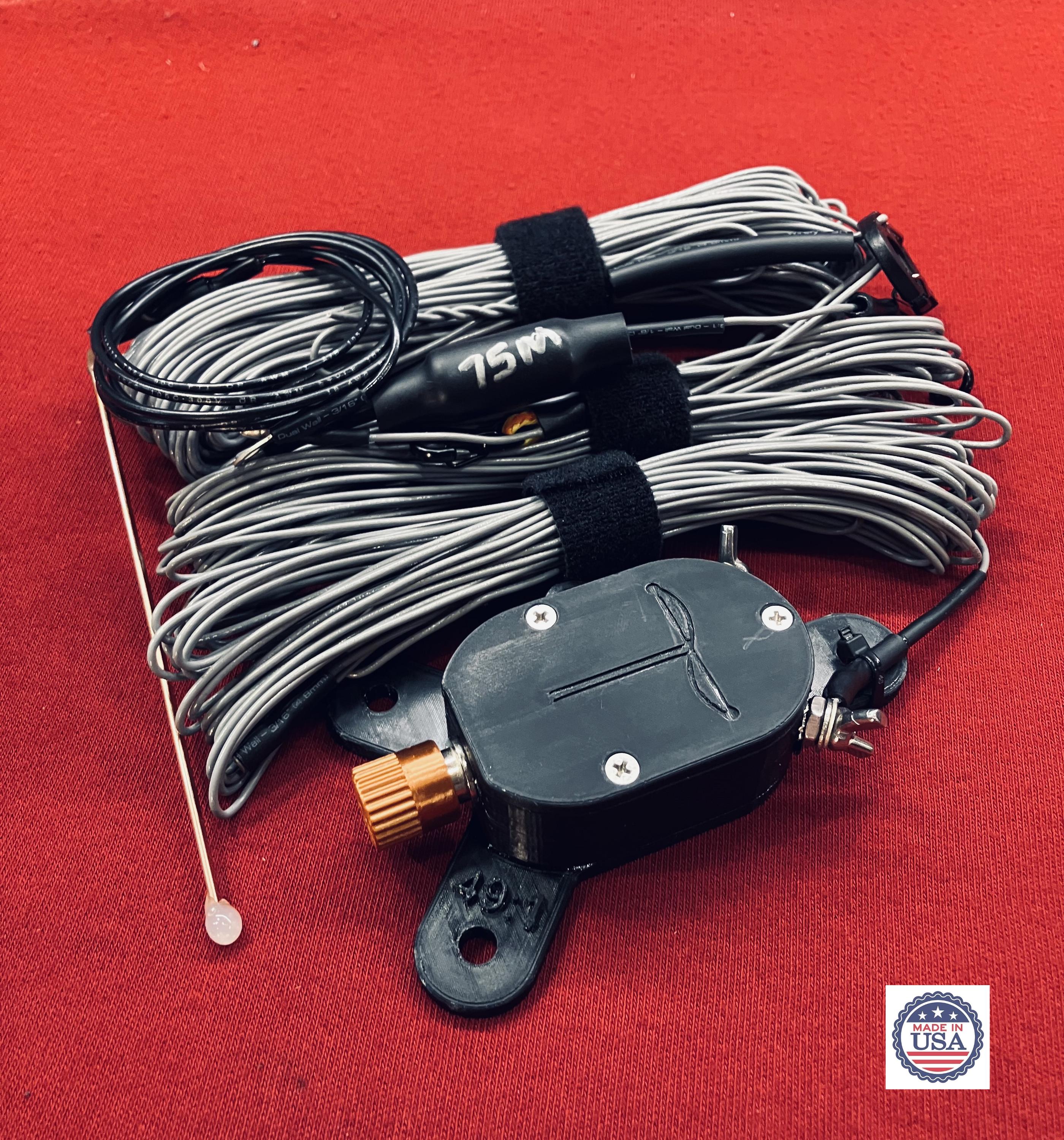 Radiating Elements: ~32 ft. (half wave at 20M) ~65 ft (half-wave at 40m) and ~128 ft. of 22 AWG UL 1007 stranded copper wire, balancing weight, flexibility, and durability.